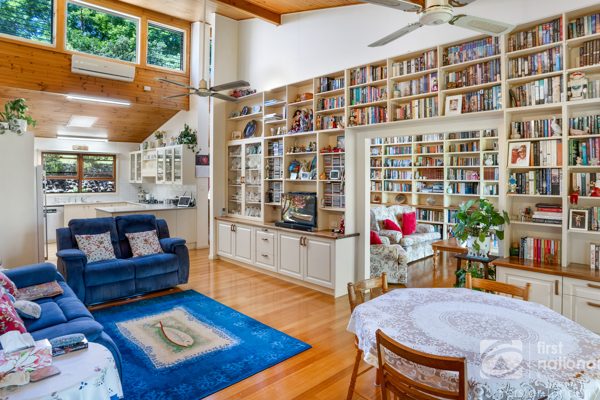 The expansive indoor living options are further complemented by a generous alfresco dining area. Protected by a roof and retractable blinds, the alfresco space is ideal for hosting gatherings year-round, surrounded by the beauty of nature.